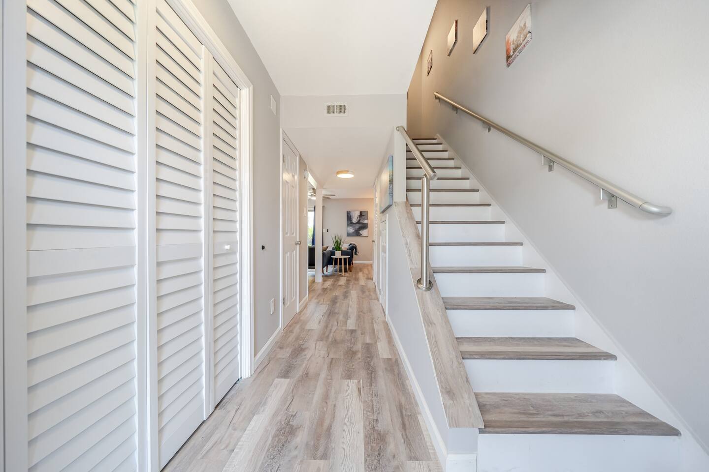 Please be respectful to neighbors and community. This is a special place where we are energy conscience and community focused. We want our guest to enjoy themselves but please no smoking or parties inside. Washer and Dryer included in the unit along with 3 bedrooms upstairs that share 2 full bathrooms. There is an outside patio and short walk to pools, lake, tennis courts, beach and even shops and few bars. Each unit allows 2 vehicles only , no trailers, no boats, no golf cars.